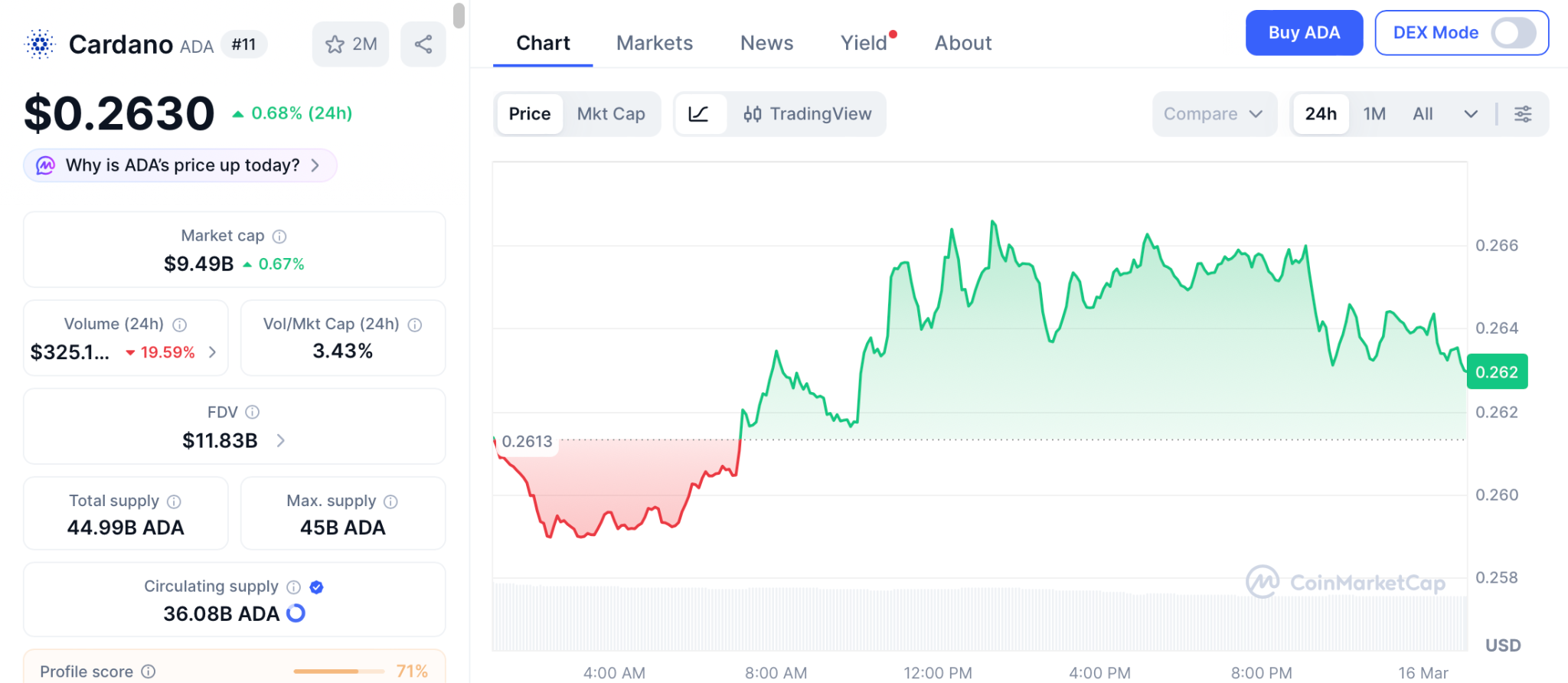 ADA ត្រូវបានជួញដូរក្នុងតម្លៃ ០.២៦ដុល្លារគិតត្រឹមថ្ងៃទី ១៥ ខែមីនា នេះបើយោងតាម CoinMarketCap ដែលកើនឡើងបន្តិចបន្តួចពីតម្លៃទាបបំផុតថ្មីៗនេះ ខណៈដែលអ្នកជួញដូរវិលត្រឡប់ទៅរក altcoins វិញ។ ប្រព័ន្ធអេកូឡូជី DeFi បានខកខានគោលដៅ ១ពាន់លានដុល្លារនៃ TVL ដែលបញ្ជាក់ថាការអភិវឌ្ឍន៍មិនបានបកប្រែទៅជាលំហូរចូលដែលសហគមន៍រំពឹងទុកទេ។
